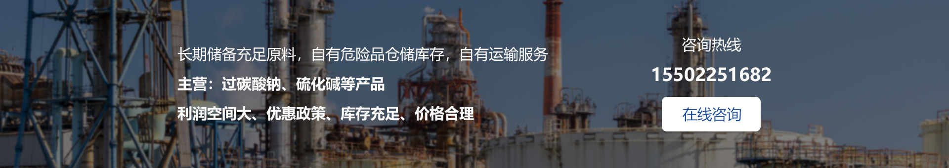 我公司自有危險品儲存?zhèn)}庫,自有的運輸隊伍和三位一體的運營模式,使我公司在市場中有著廣闊的發(fā)展前景和拓展空間。我廠生產(chǎn)及代理產(chǎn)品主要有:五水偏硅酸鈉、聚丙烯酰胺、硫化鈉、活性炭、磷酸三鈉、純堿等......